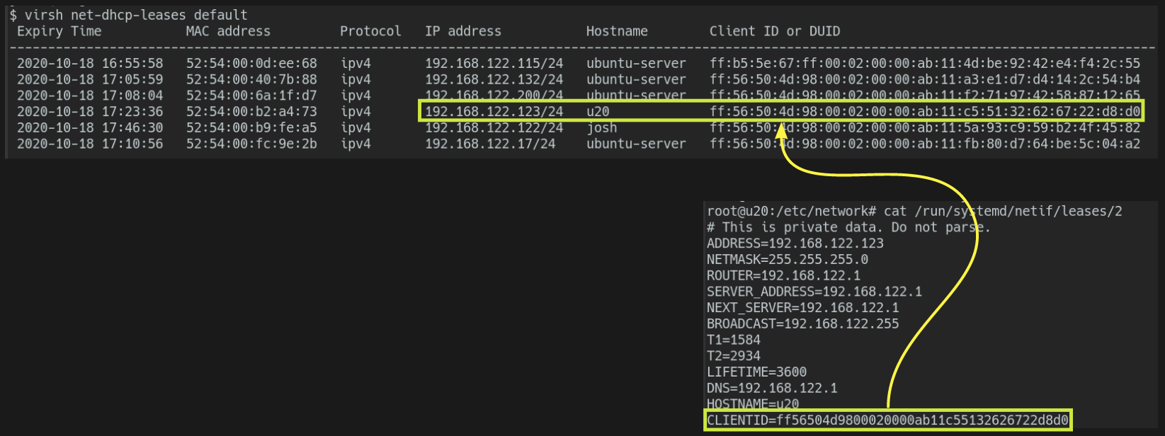 virsh net-dhcp-leases default taco: Mon Oct 19 07:58:12 2020 IP address Hostname Client ID or DUID ------------------------------------------------------ 192.168.122.134/24 uym 01:52:54:00:cc:50:fa <== new host 192.168.122.123/24 u20 01:52:54:00:cf:44:d7 <== old base image