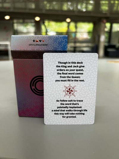 Recently, I recieved a cool card deck and a t-shirt of questionable quality from a guest speaker at Columbia. Upon further inspection yesterday I realized that there was an extraneous card that held a cryptic clue: